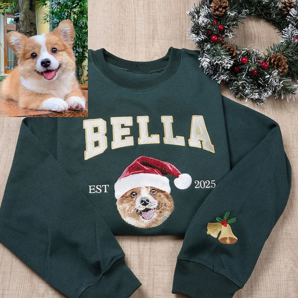 Our Custom Embroidered Pet Portrait Sweatshirt turns your favorite photo into a beautifully detailed embroidery, framed with festive Christmas patterns for the perfect seasonal look.