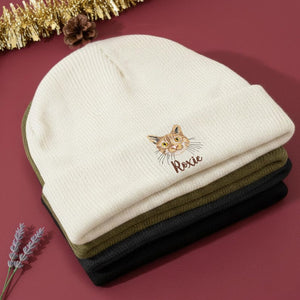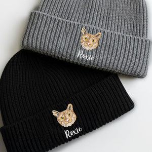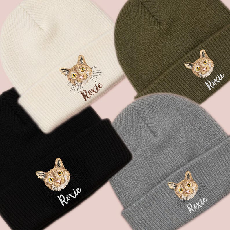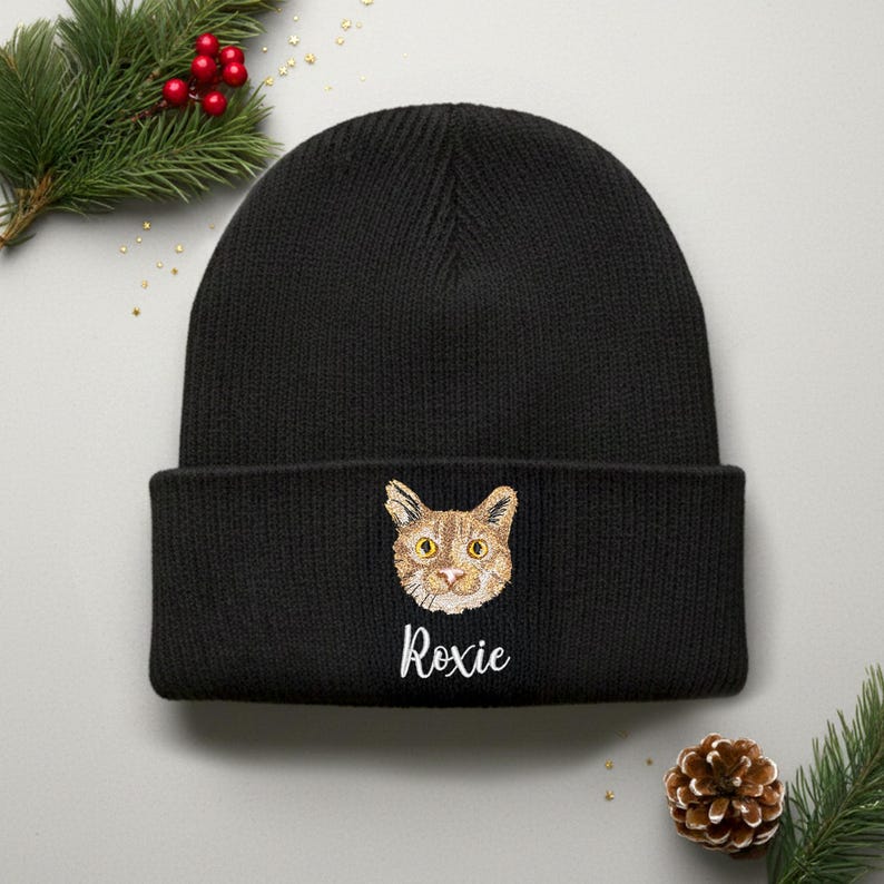 Personalized Embroidered Cat Photo Beanie, Custom Pet Portrait Winter Hat Gift for Cat Mom, Christmas Gift for Pet Lovers