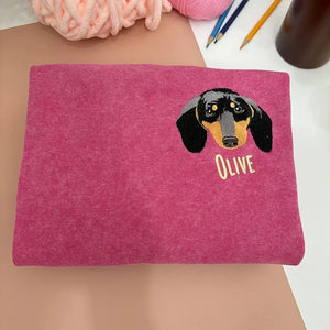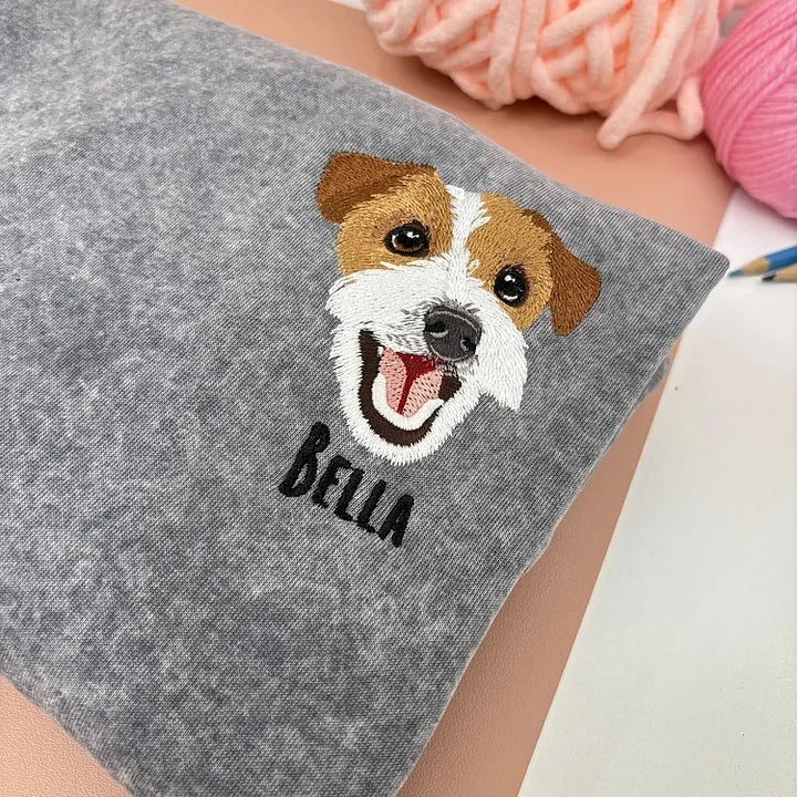 Each garment is custom-embroidered using your pet's photo, creating a soft, vintage-inspired wearable tribute perfect for everyday love.