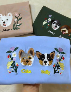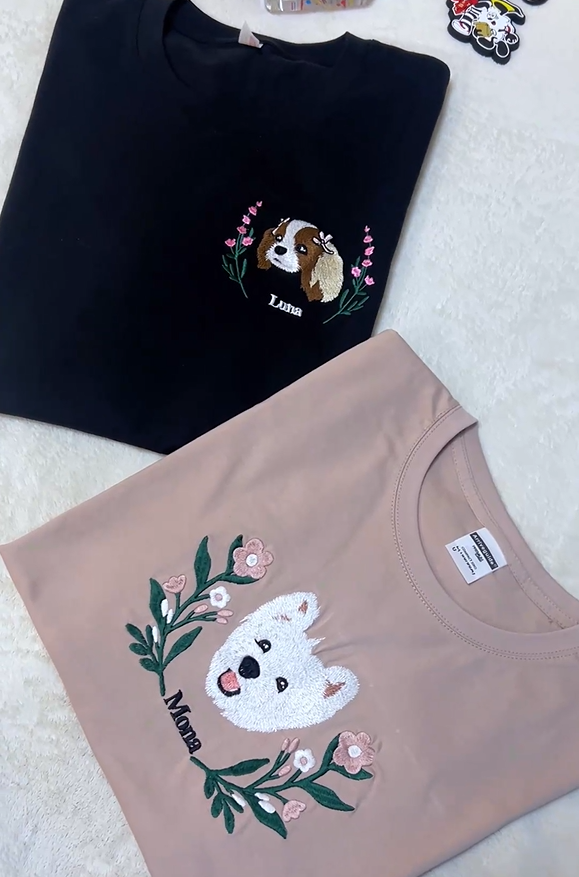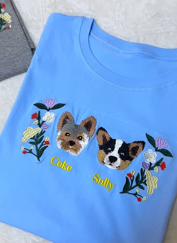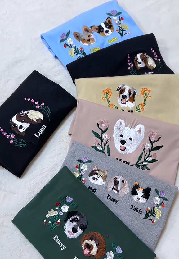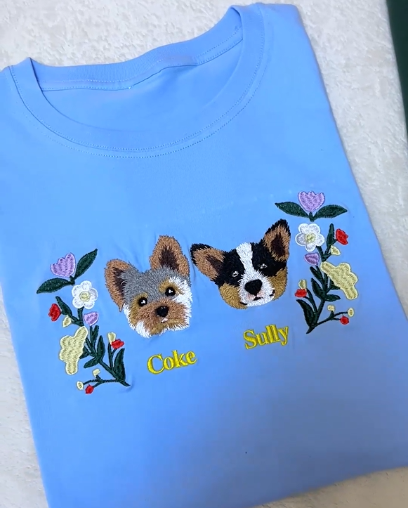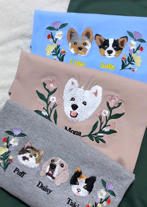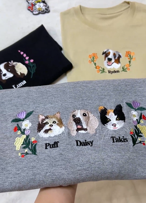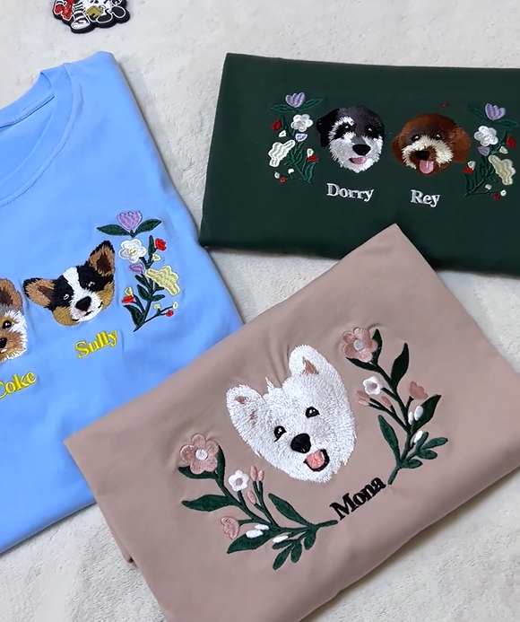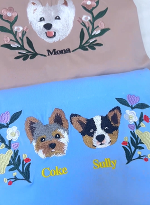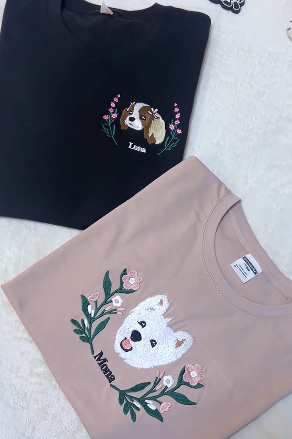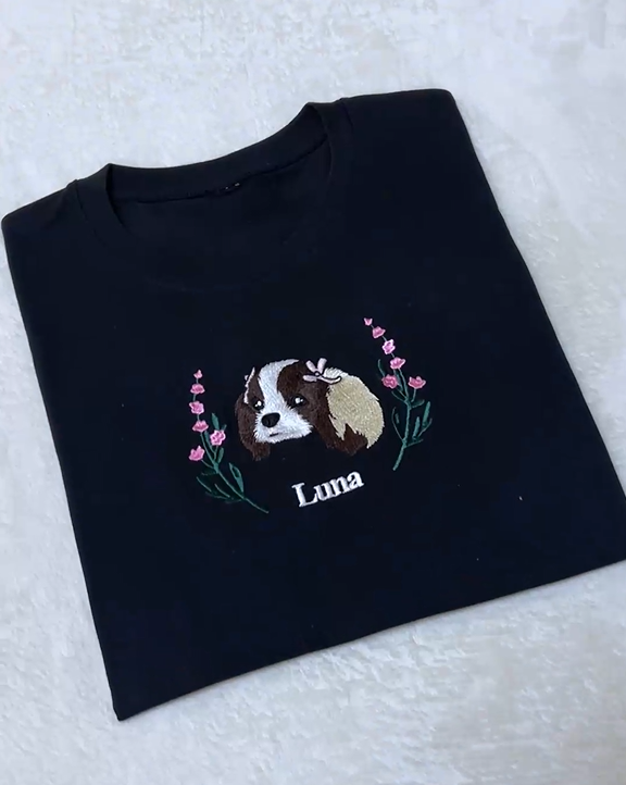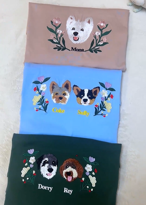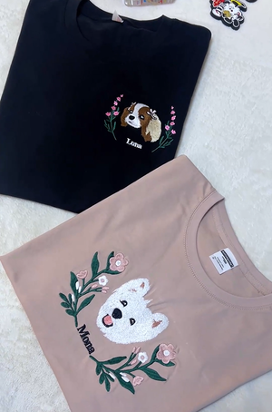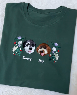 Custom Premium Handcrafted Pet Photo Embroidery T-shirt Sweatshirt Hoodie with Wreath Design